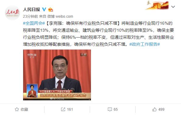 3月5日上午9时,十三届全国人大二次会议开幕,国务院总理作政府工作报告。报告指出,确保所有行业税负只减不增。