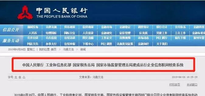 6月26日,中国人民银行、工业和信息化部、国家税务总局、国家市场监督管理总局四部委联合召开企业信息联网核查系统启动会,共同运行企业信息联网核查系统。