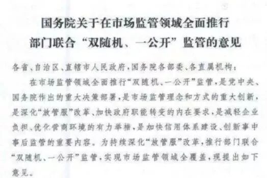 近日,经总理签批,国务院印发了《关于在市场监管领域全面推行部门联合“双随机、一公开”监管的意见》(以下简称《意见》)