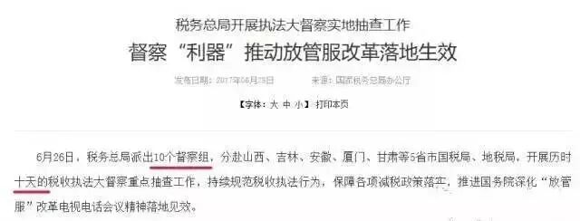 据《经济观察报》报道,2017年6月国家税务总局选取10个省税务机关开展跟踪督导和检查工作,据了解,目前执法大督察已进入省局重点抽查阶段。