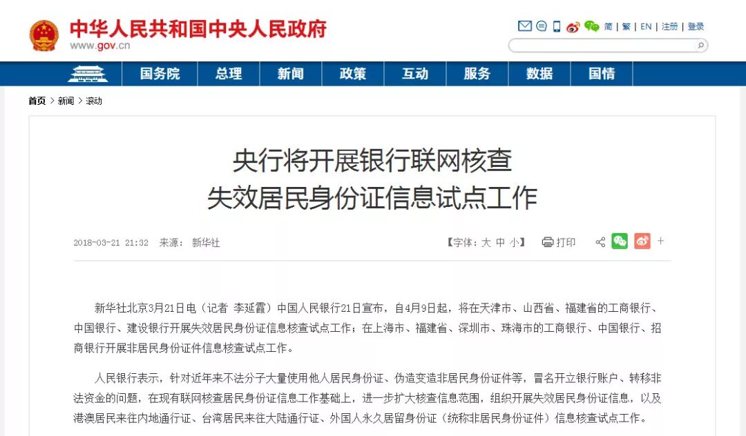 中国人民银行3月21日宣布,自4月9日起,将在天津市、山西省、福建省的工商银行、中国银行、建设银行开展失效居民身份证信息核查试点工作;在上海市、福建省、深圳市、珠海市的工商银行、中国银行、招商银行开展非居民身份证件信息核查试点工作。