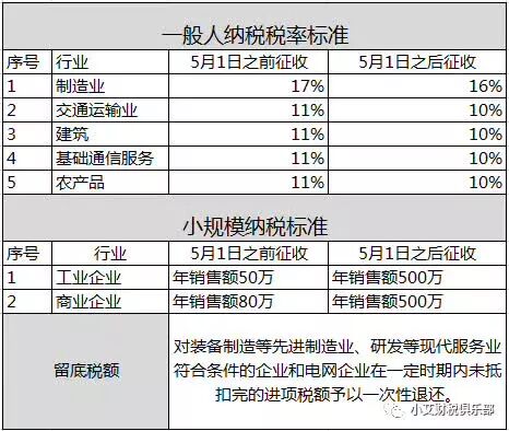 除了增值税税率下调外,在32号文中还将工业企业和商业企业小规模纳税人的年销售额标准由50万元和80万元上调至500万元,并在一定期限内允许已登记为一般纳税人的企业转登记为小规模纳税人。