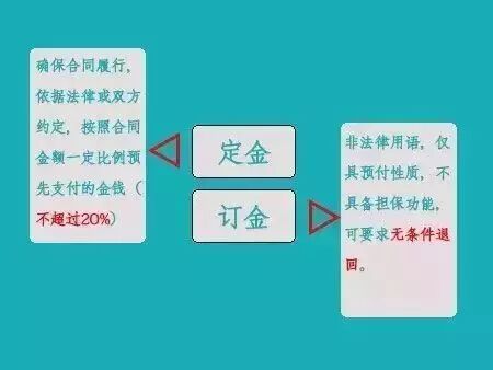 三、定金与订金的法律后果不同。给付定金的一方不履行约定的债务的,无权要求返还定金;收受定金的一方不履行约定的债务的,应当双倍返还定金,适用定金罚则。