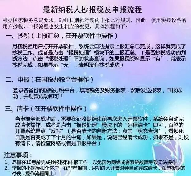 5月份征收期是第一次这么操作,很多会计不知道申报升级变更,还是按照以往的方式,月初一上班就接着进入平台发送报表,然后再进开票上报汇总后发现无法清卡,结果只能到办税服务厅重新退回报表后再重新申报,非常麻烦,因此,为了6月份能更好的进行申报工作,所有财务会计人员一定要在月底告知企业开票人员,月初上班第一件事,就是打开开票软件,进行上报汇总操作。